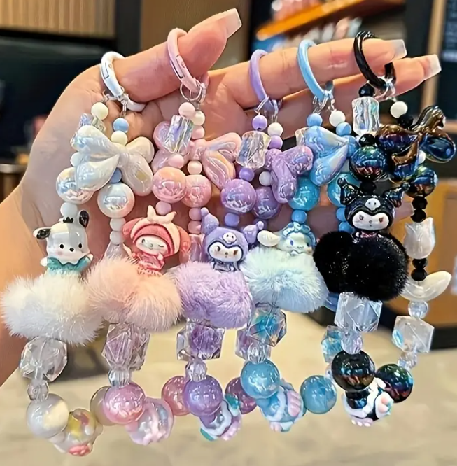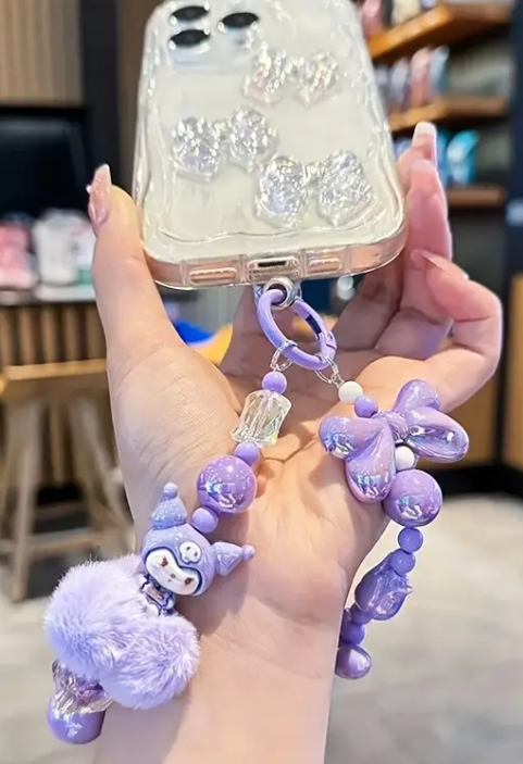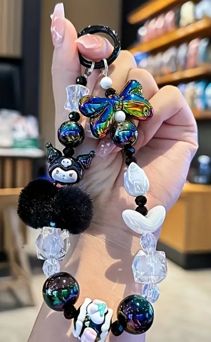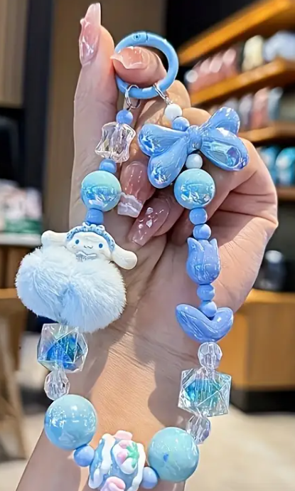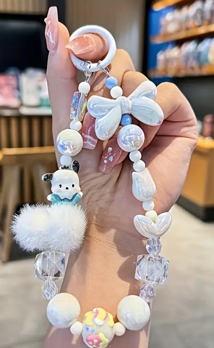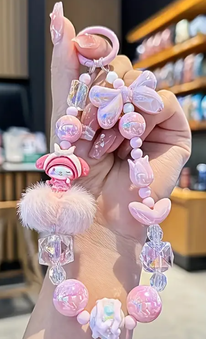 Multifunktionellt band som fungerar både som mobilhållare eller nyckelband! Kawaii-inspirerad design med gulliga skimrande pärlor i pastellfärger och söta rosetter. 🌸
