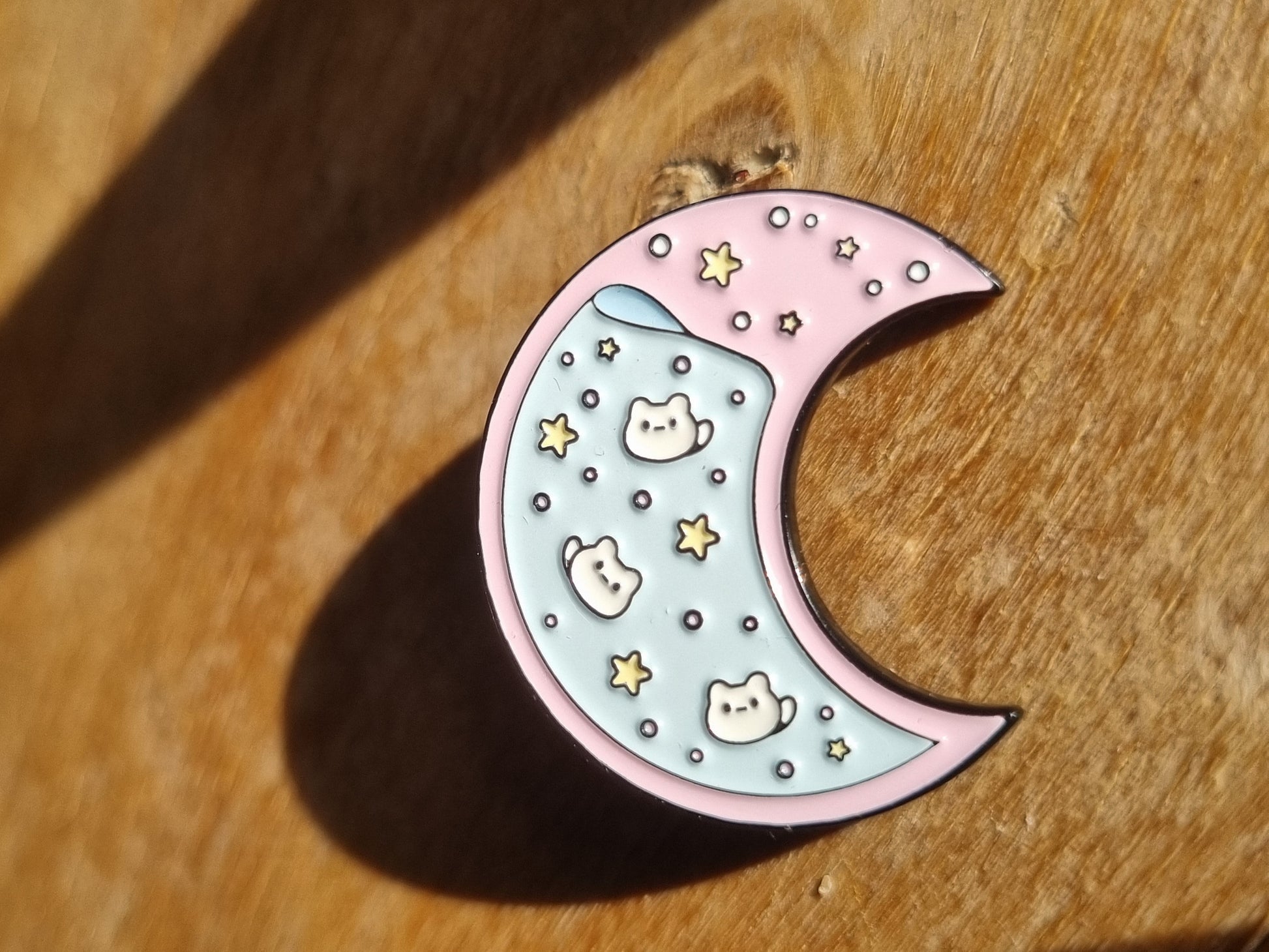 Bubbly moon pin är en månformad emaljnål med bild av kattspöken och bubbeldryck i dova pastellfärger.