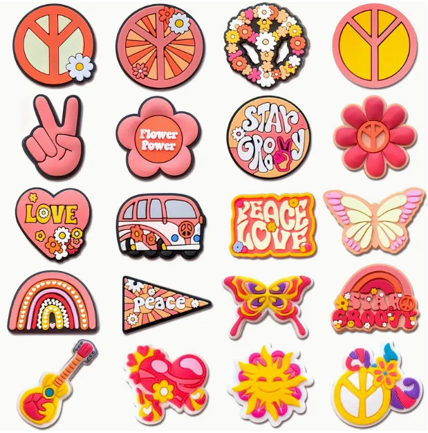 Charms med tidstypiska symboler för hippe-eran som blomster, folkvagnsbussar och fredsmärken med flera. Dessa charms passar likväl Crocstofflor som våra mobilväskor.